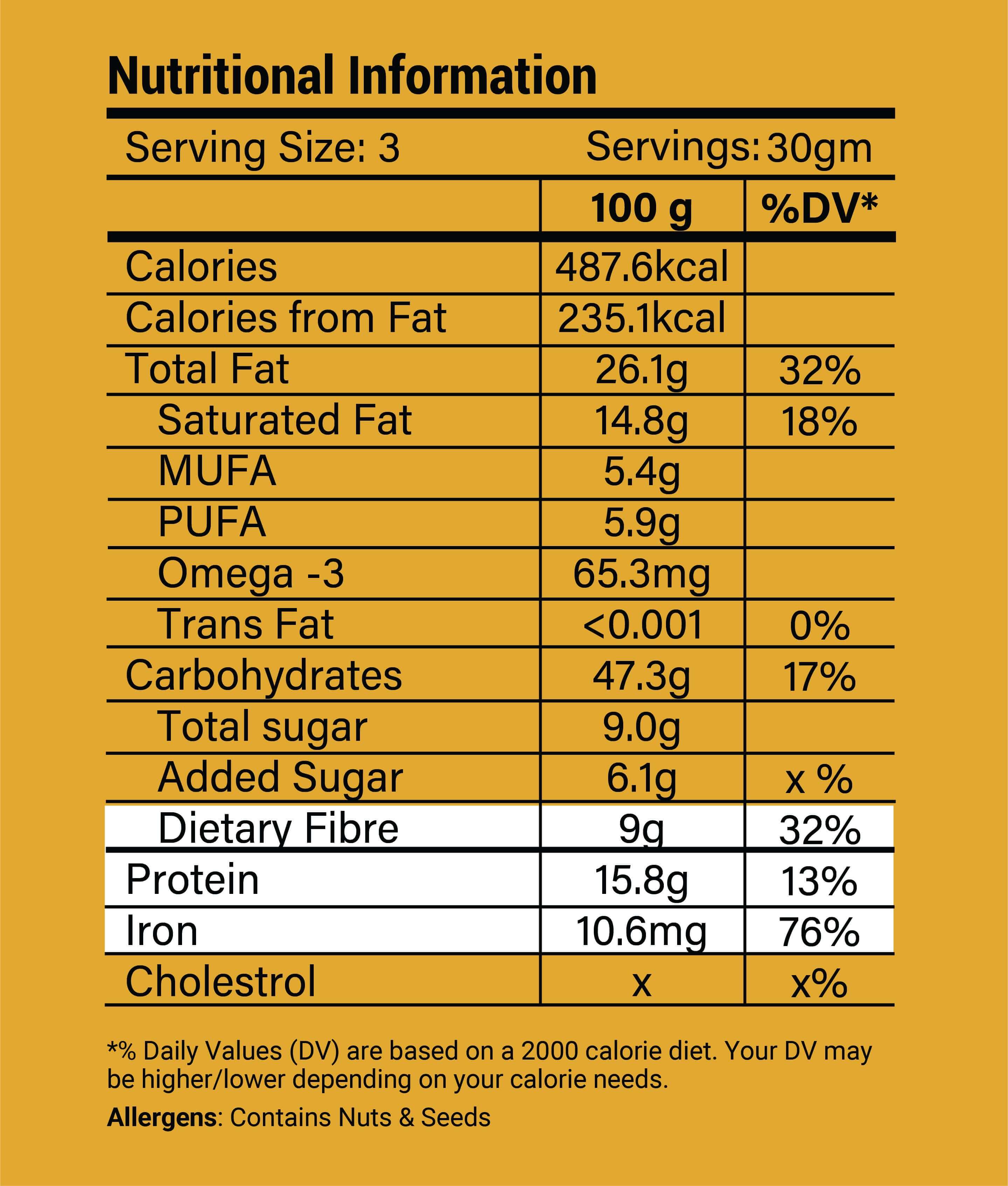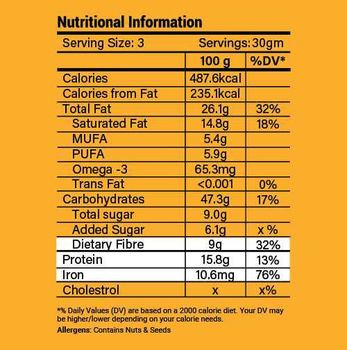 Millet puffs 36% (Jowar, Bajra), pumpkin seeds, groundnuts, chickpeas, coconut oil, coconut flakes, liquid jaggery and mixed spices (Onion powder, Garlic powder, Chilli flakes, Pink Salt)